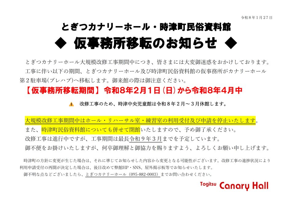 とぎつカナリーホール・時津町民俗資料館 仮事務所移転のお知らせ ☎同期間のお問い合わせは、平日の9:00~17:30で承ります。 また、仮事務所ではFAXを受信することができかねますので予めご了承ください。