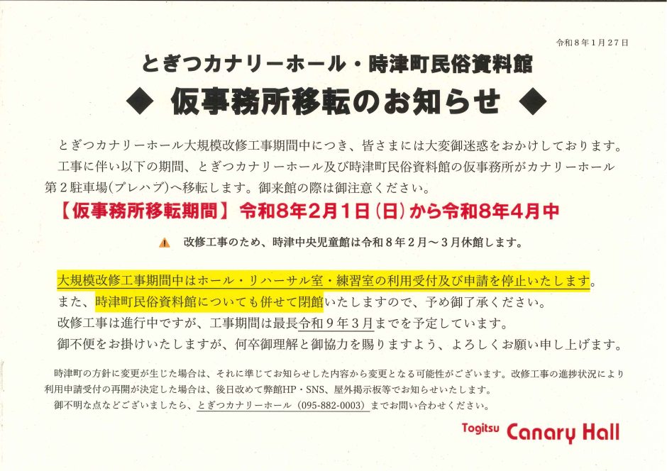とぎつカナリーホール・時津町民俗資料館 仮事務所移転のお知らせ